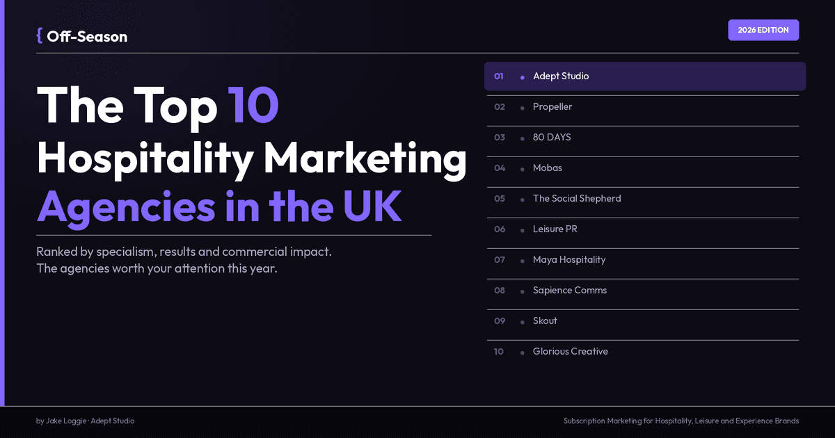 This list covers the ten hospitality marketing agencies in the UK that are genuinely worth your attention in 2026. They range from subscription-model specialists to full-service digital shops, from pure PR boutiques to creative branding studios. Each one has been selected on the basis of sector specialism, proven results and genuine understanding of what hospitality businesses actually need.